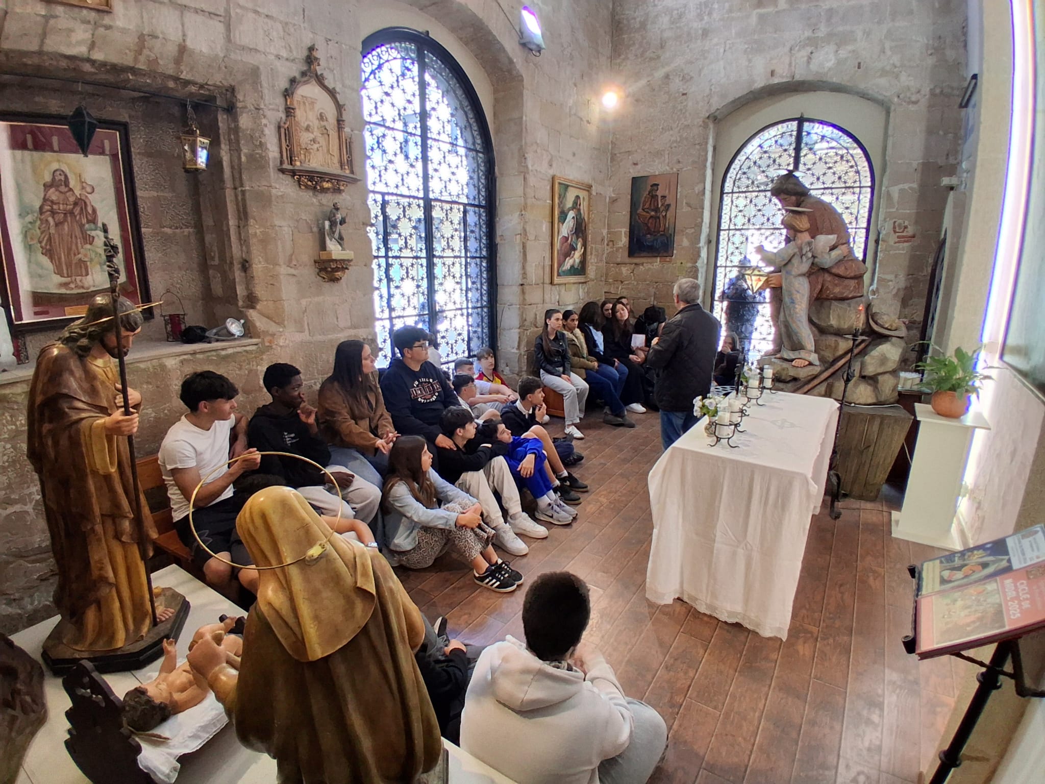 Prop d’un centenar d’alumnes, distribuïts en tres grups, de tercer curs d’ESO del Col·legi Episcopal de Lleida han visitat, el 15 d’abril, la capella de Sant Jaume del Peu del Romeu, seu de l’Agrupació Ilerdenca de Pessebristes.