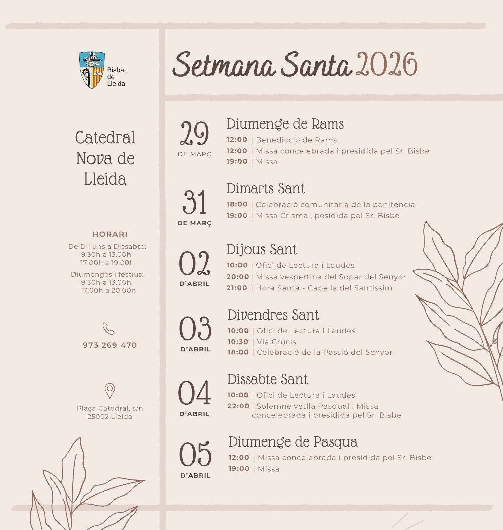 La Catedral Nova de Lleida ha fet públic el calendari d’actes litúrgics per a la celebració de la Setmana Santa 2026, amb un conjunt de cerimònies que s’estendran del 29 de març, Diumenge de Rams, al 5 d’abril, Diumenge de Pasqua.