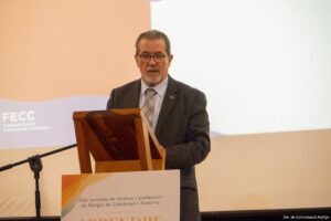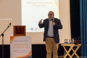 La ponència principal de la jornada ha anat a càrrec d’Antonio Roura, director del secretariat d’educació i cultura de la Conferència Episcopal Espanyola, i s’ha centrat en la presentació del context de la carta apostòlica del papa Lleó XIV “Dissenyar nous mapes d’esperança”. Aquest document va ser presentat a la setmana del Jubileu de l’Educació del passat mes d’octubre en motiu dels 60 anys del document conciliar Gravissimum Educationis (1965)i és el text programàtic de l’actual pontificat pel que fa a temàtica educativa. Roura ha destacat que “educar és aixecar la gent del terra”, on la tríada educativa clàssica presentada a Gravissimum Educationis (Escola, Família i Església) ja no és un sumatori de tres identitats separades sinó una nova unitat educativa que cerca, primer de tot, la cura per la dignitat de la persona humana. Roura ha destacat la visió programàtica del text, indicant que “l’educació no és adaptar per o al present, sinó comprendre el present per tal de fer habitable el futur”. Referent a la situació educativa actual, Roura ha indicat que “No es tracta de si som els millors en innovació pedagògica, sinó de construir el futur sense deixalles humanes”, per a això “cal proposar motius reals per viure amb esperança”. Llambregant el futur, la ponència ha destacat l’interès del papa Lleó en el transhumanisme, entesa com la nova religió de l’actualitat en un estat social límbic on “parlem de Jesús en un món que ja té el seu salvador en la tecnologia: el verb s’ha fet codi”.